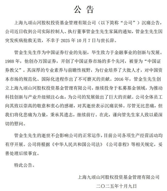 10月9日深夜11点,上海九颂山河股权投资基金管理有限公司(以下简称九&颂基金)发布公告称,近日收到公司实际控制人、执行董事管金生先生家属的通知,管金生先生因突发疾病抢救无效,不幸于2025年10月7日与世长辞。